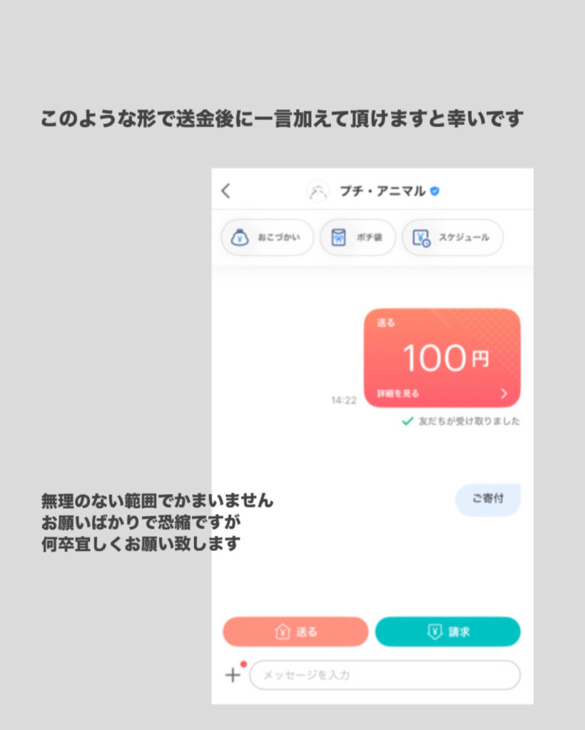 送金後、「ご寄付」などと一言送信していただけると大変助かります